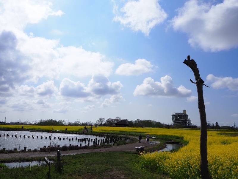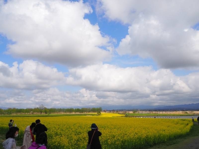 福島潟 菜の花畑 田原組から車で10分の所に福島潟という公園があります。多種多様な野鳥や植物が観察できる自然公園です。その福島潟で菜の花が見頃を迎えています。壮大なスケールに圧倒されます。田原組スタッフ一押しのオススメスポットです。
