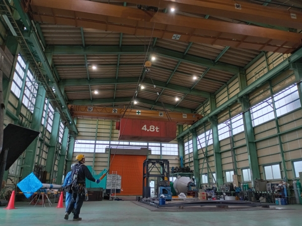 クレーン点検 2年に1回のホイストクレーン性能検査を実施しました。車でいう車検のようなものです。重りを吊って移動させ問題が無いか、たわみはどれくらいかなどを検査します。特に指摘なく終えることが出来ました。安心して作業が行えます。 田原組では4.8トンのクレーンを2台保有していますので、10トン近くまでの製作物が可能になります。