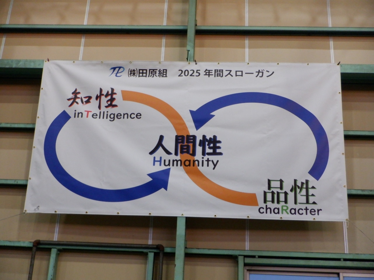 田原組 令和7年度 年間スローガン 令和7年の田原組年間スローガンが決定しました。 今年の年間スローガンは 「知性 品性 人間性」です。 昨年の年間スローガンは「心鍛心磨/しんたんしんま」 文字の如く自らの心を鍛え、磨いていく事を目標にした1年でした。 そして昨年に鍛え磨いた心を今年は「知性」として「品性」として「人間性」として 表現していく事を目標としたスローガンとなっております。 令和7年も何事にも全力で取り組んでいく田原組を今年も宜しくお願い致します。