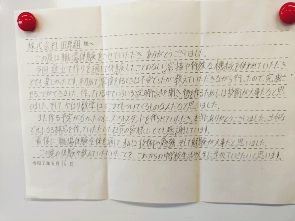 中学生職場体験 今年も近隣中学校の生徒さんが職場体験に来てくれました。今年は傘立てとスマホホルダーの2種類の製作を行いました。女子生徒さんが2名でしたが、少しは溶接やものづくりに興味を持ってくれたようです。生徒さんたちの未来にエールを送りたくなるそんな一日でした。 後日生徒さんよりお礼のお手紙をいただきました。ありがとうございます!