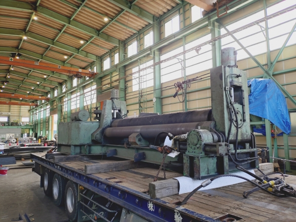 旅立ち 長年にわたり田原組の製缶を支えてくれた3本ロールベンダーが入替のために旅立って行きました。この機械を使って何本のタンクを作ったのか覚えていませんが、製缶作業には欠かすことのできない機械なのです。コンピューターなど一切なく完全な油圧機械で、長年取り続けたデータと勘のみで曲げ作業を行ってきました。初めは使い辛かったのですが、使いこなせる今は愛着のある相棒みたいなものです。長年支えてくれて心からありがとう。