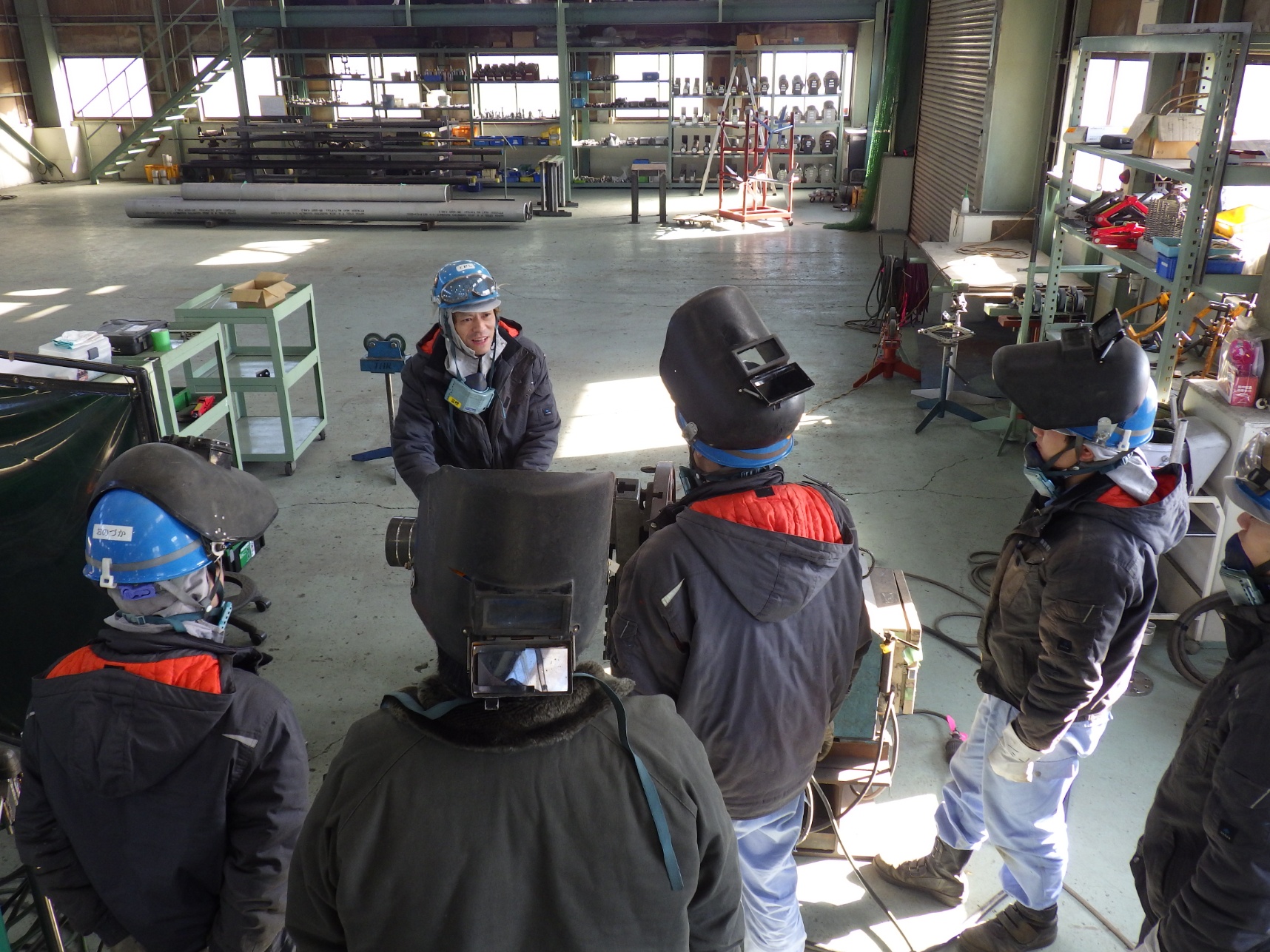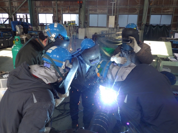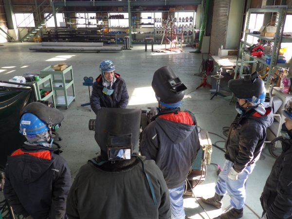 半自動溶接勉強会 半自動溶接の勉強会を行いました。若手メンバーを中心にベテラン先輩が取り扱い方や溶接する時のコツなどをレクチャーします。 分からない事はベテラン先輩が丁寧に教えてくれるので心配はありません。この後の技術や知識は本人の努力次第でいくらでも伸びていきます。 若手メンバー頑張れ!