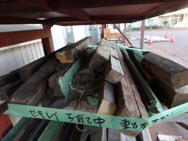 そっとしといて 田原組で完成した製品や材料を仮置きする際に使用する角材置き場があります。 毎年ですがセキレイが間借りして巣を作ります。 少しの間だけスタッフも、角材を動かさないように注意します。 現在は親鳥が一生懸命抱卵中です。 ヒナがかえり巣立ちを迎える日を、スタッフ一同静かに見守る毎日です。