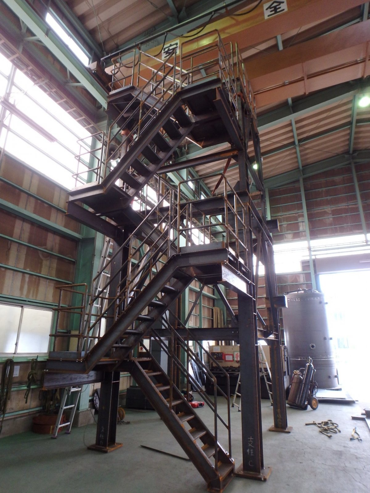 架台の製作をさせて頂きました。亜鉛メッキ前の仮組立てを行っています。高さが8mありますが、弊社工場は大型製作物も対応可能です。