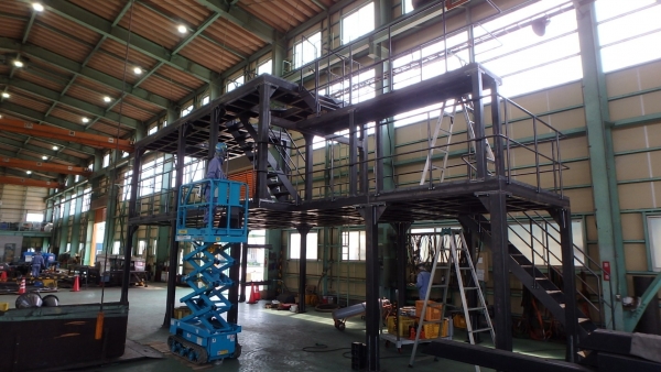架台を製作させていただきました。田原組工場で仮組立をして整合を確認してから塗装工程に入ります。この架台を今回は現場取付まで行います。